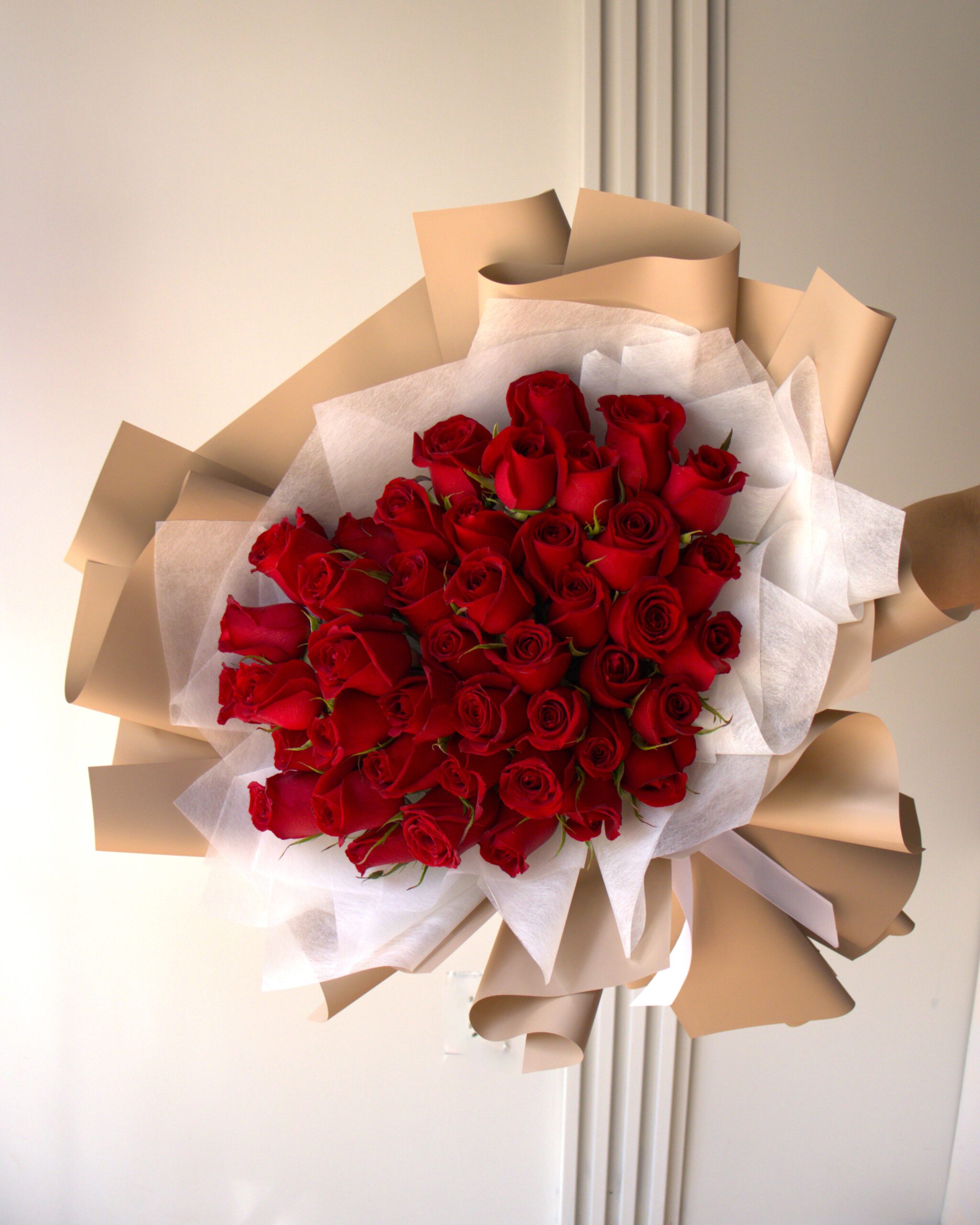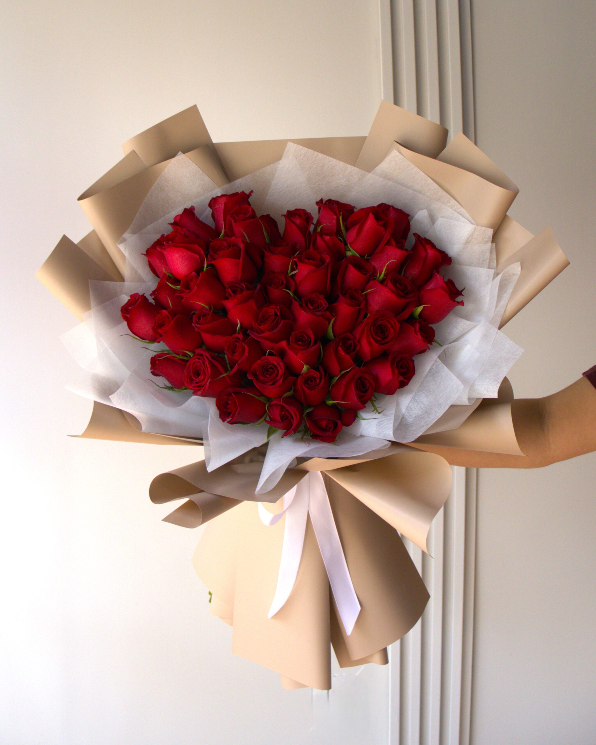 Elegante ramo a base de rosas rojas estilo coreano creado para expresar tu amor a tu persona favorita.