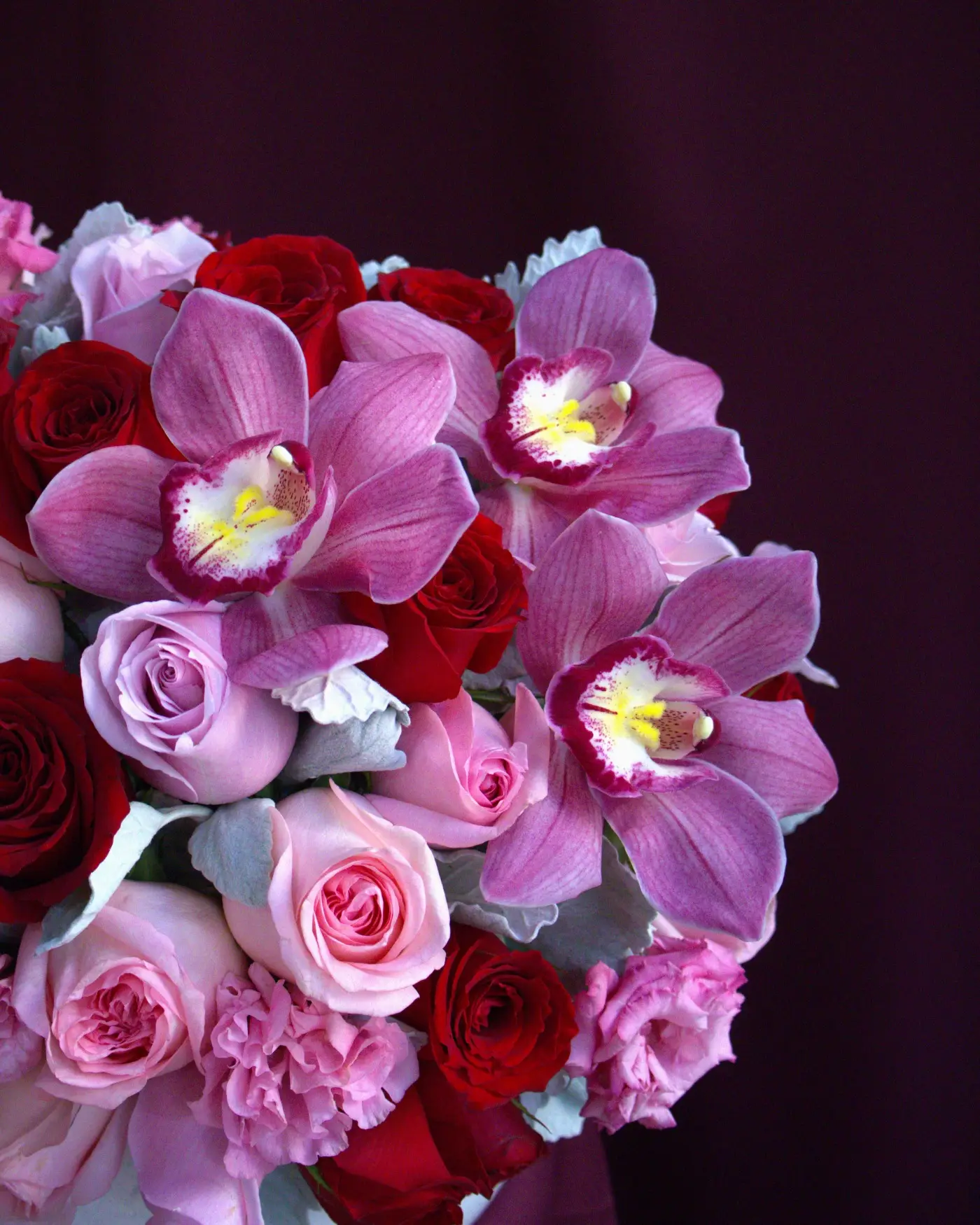 Arreglo Floral compuesto por: 30 rosas rojas, 30 Rosas Caricia, 30 Rosas Náutica, Dusty Miller, 3 Orquídeas Cymbidium, Lisianthus.