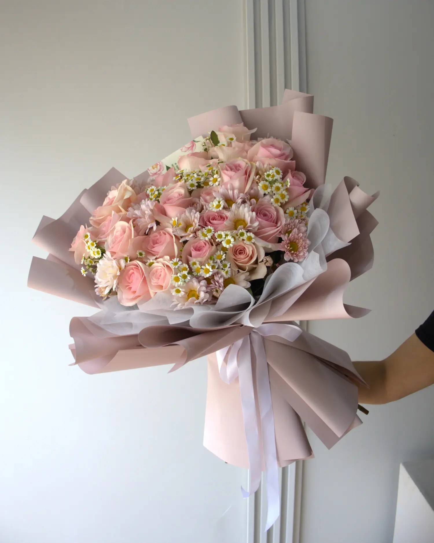 Ramo compuesto por rosas, santa maría, margaritas y ruscus.