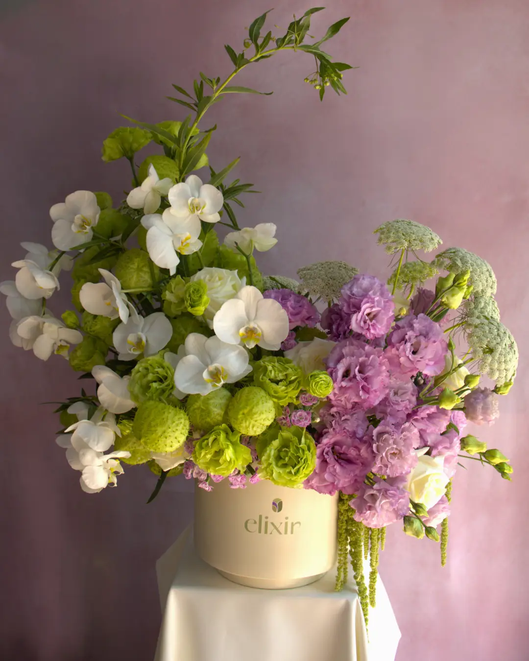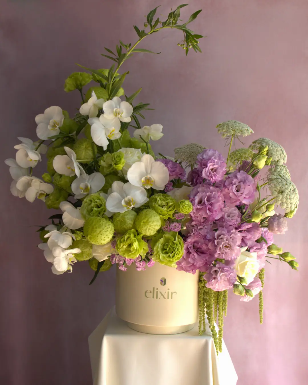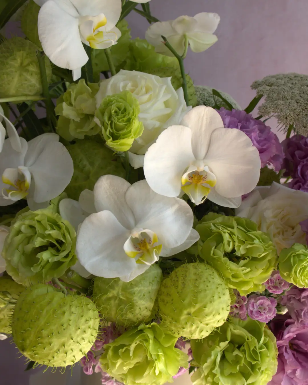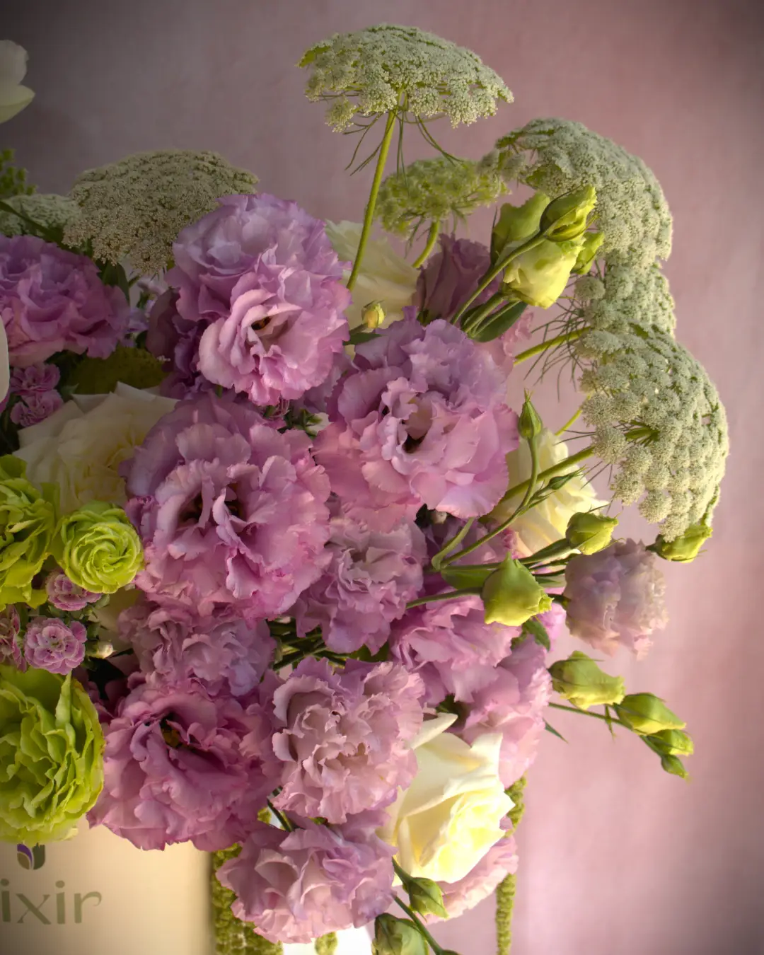 Flor Secundaria: Lisianthus, Asclepias, Encaje, Amaranto y Rosas blanca