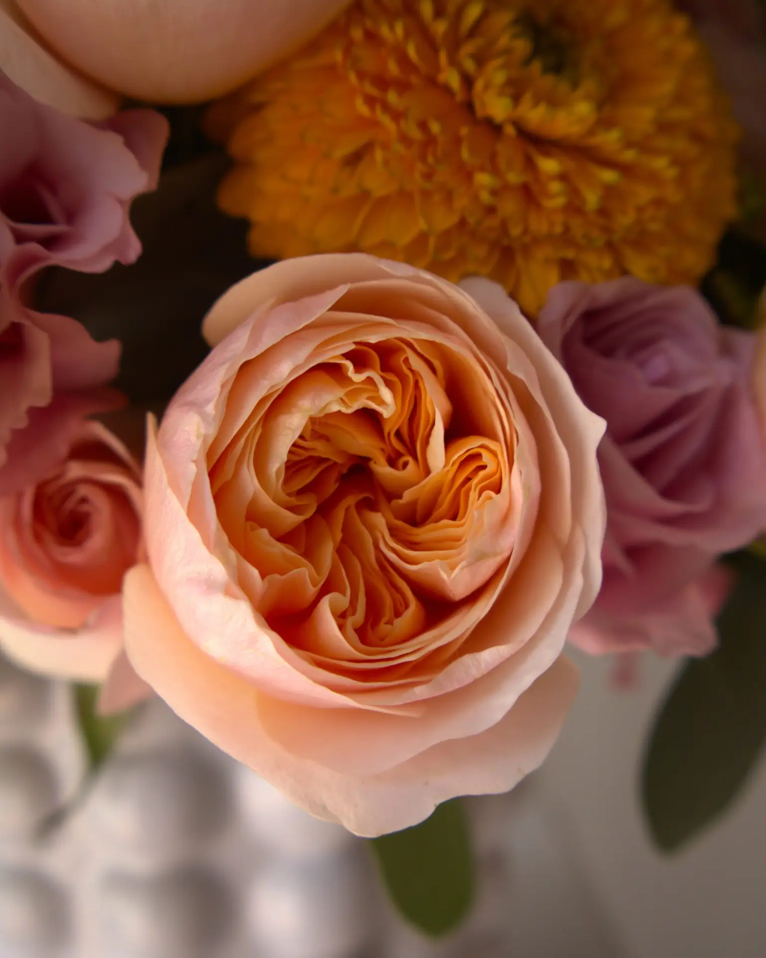 Las Rosas Inglesas, con sus pétalos gruesos y fragancias intensas, son el complemento perfecto para este arreglo. Se han seleccionado variedades de colores cálidos y delicados, que se combinan perfectamente con los tulipanes y los ranunculos.