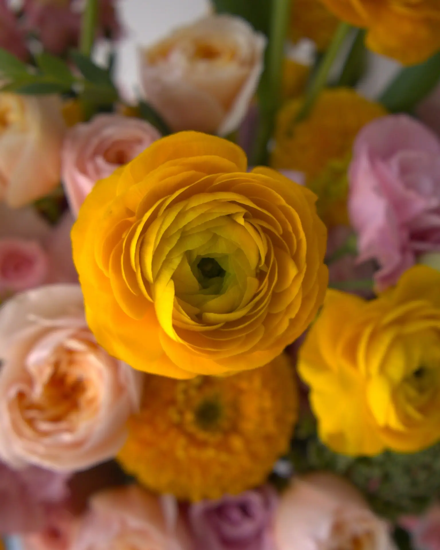 Los Ranúnculos Amarillos, con sus pétalos finos y delicados, añaden un toque de elegancia y sofisticación al arreglo. Se han seleccionado variedades de colores cálidos y delicados, que se combinan perfectamente con los tulipanes naranjas.