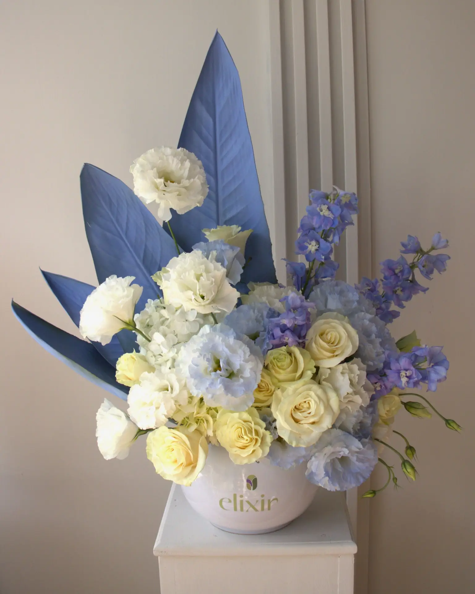 El arreglo incluye Hortensias, rosas blancas, Delfinium, Lisianthus y Hoja de ave de paraíso.