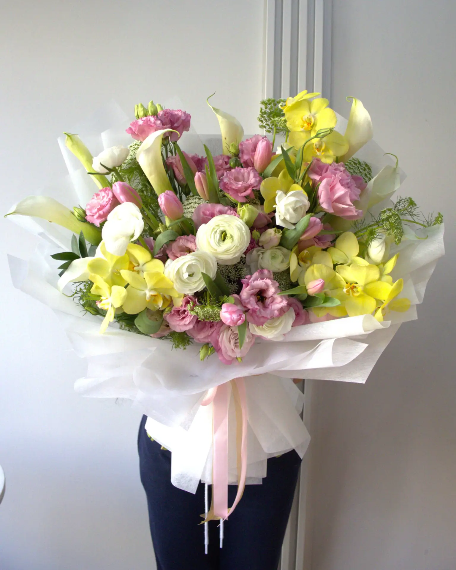 Compuesto por: Lisianthus, Alcatraz, Orquídea, Tulipán, Encaje, Ruscus, Ranúnculo.