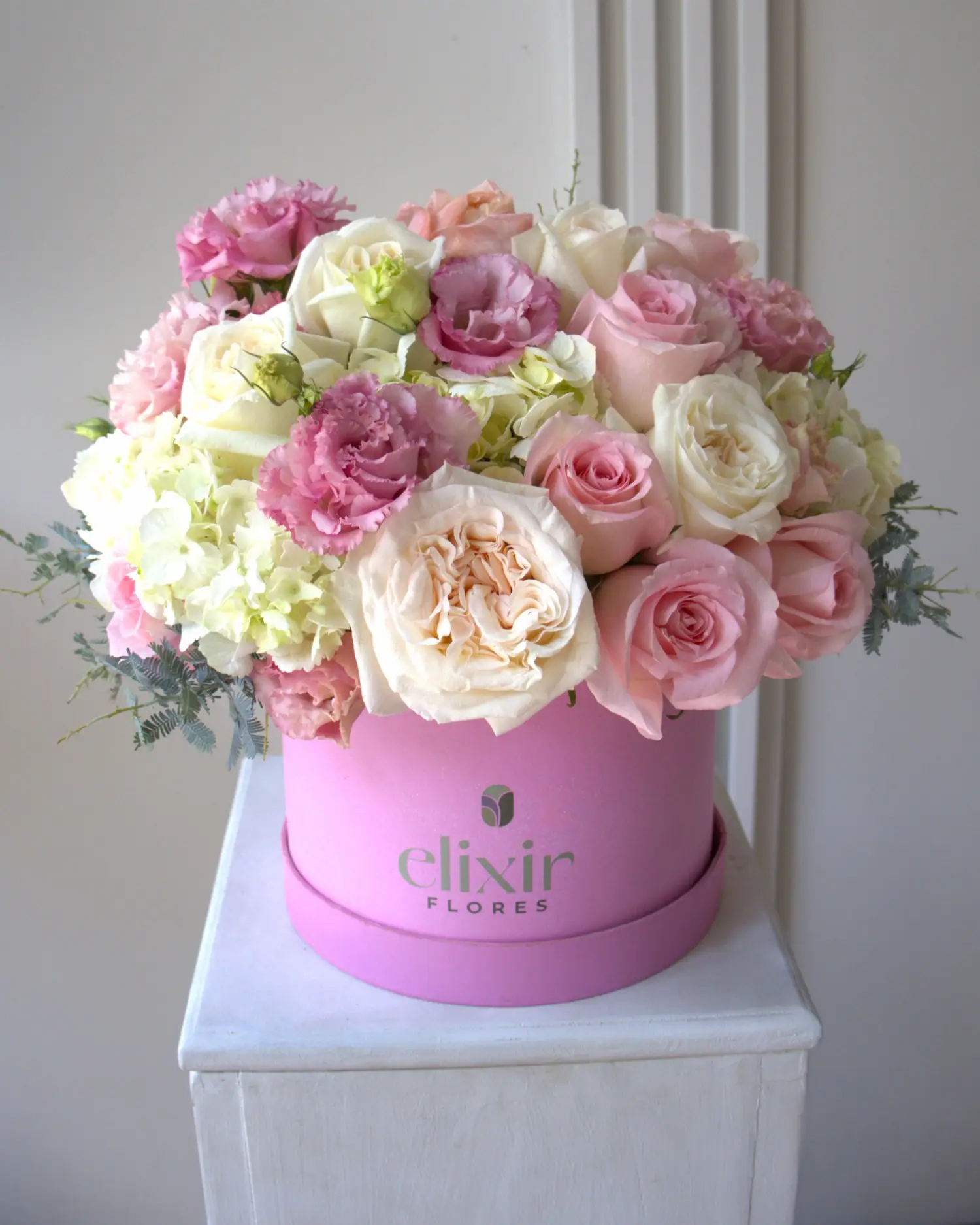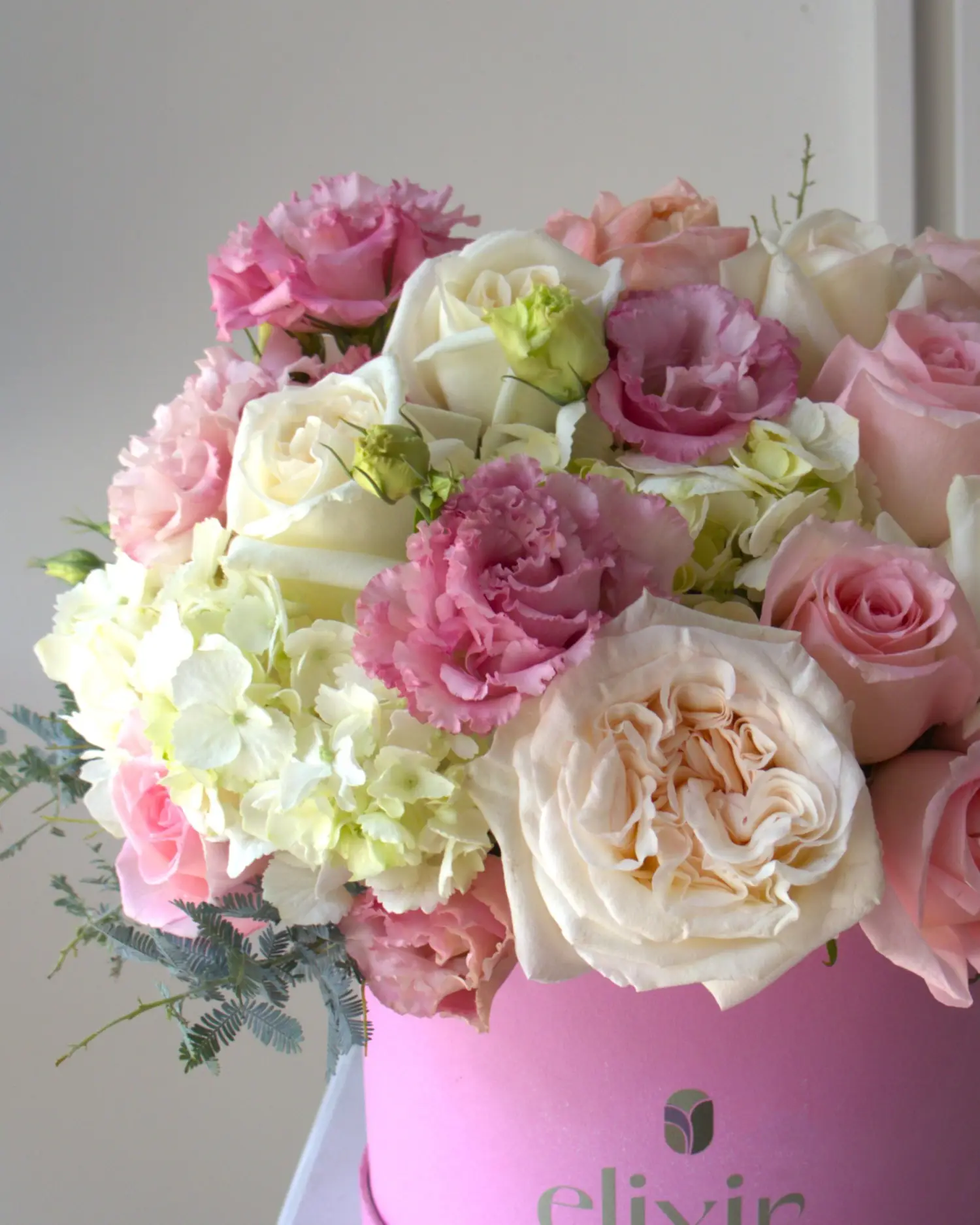 Arreglo floral compuesto por rosas ohara, lisianthus, hortensias y follajes.
