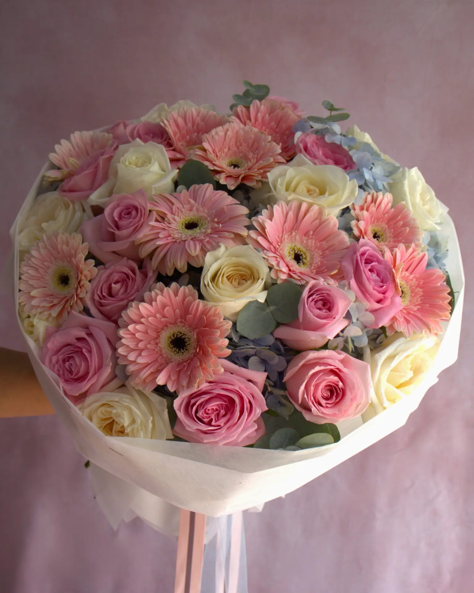 El ramo incluye Gerberas rosas, Rosa caricia, Rosa Inglesa O´Hara, Hortensia azul, dólar.