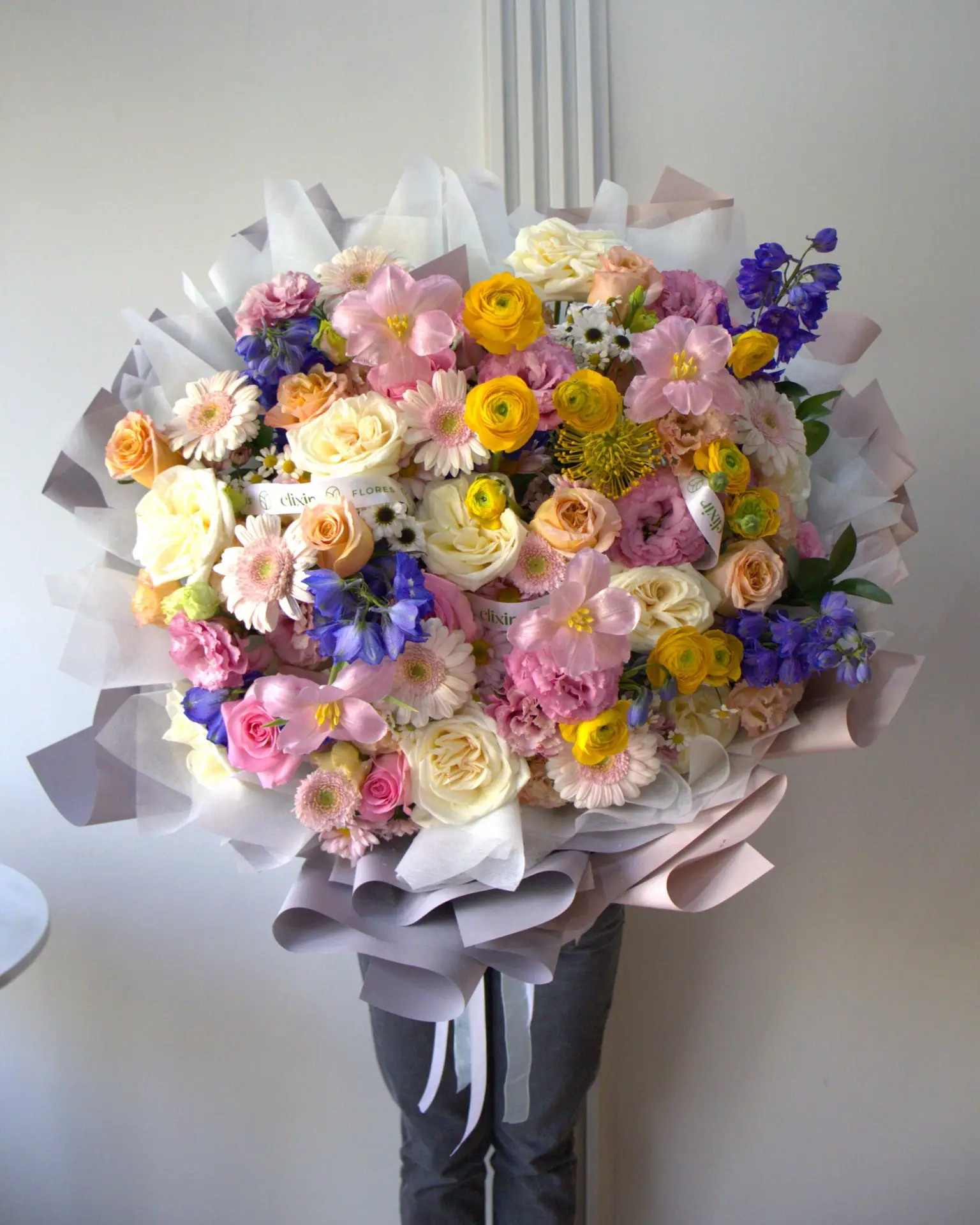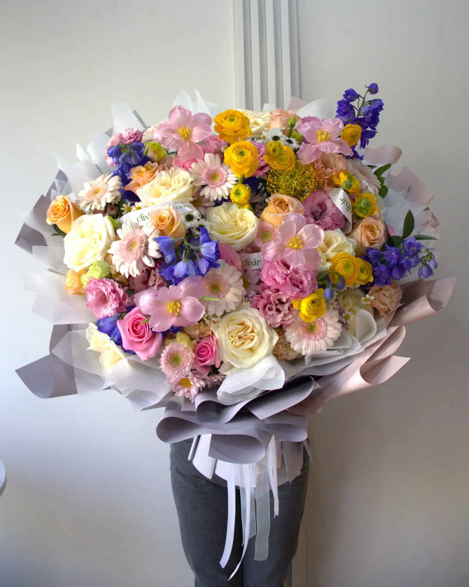Compuesto por: Lisianthus, Tulipán, Ranúnculo, Delfinium, Gerbera, Margarita, Panda, Santa maría, Rosa shimmer, Rosa caricia, Leuco.
