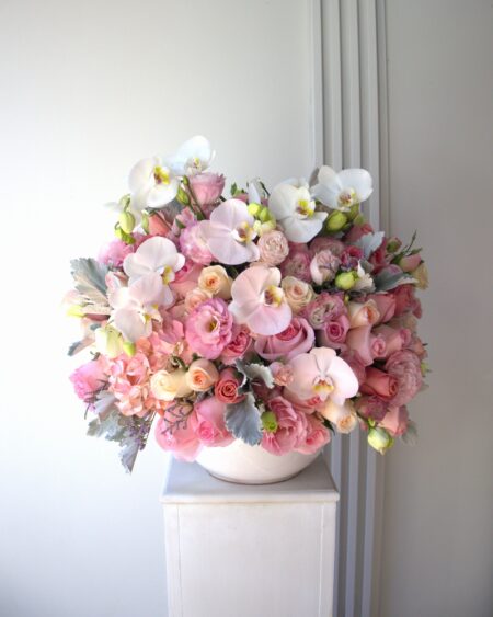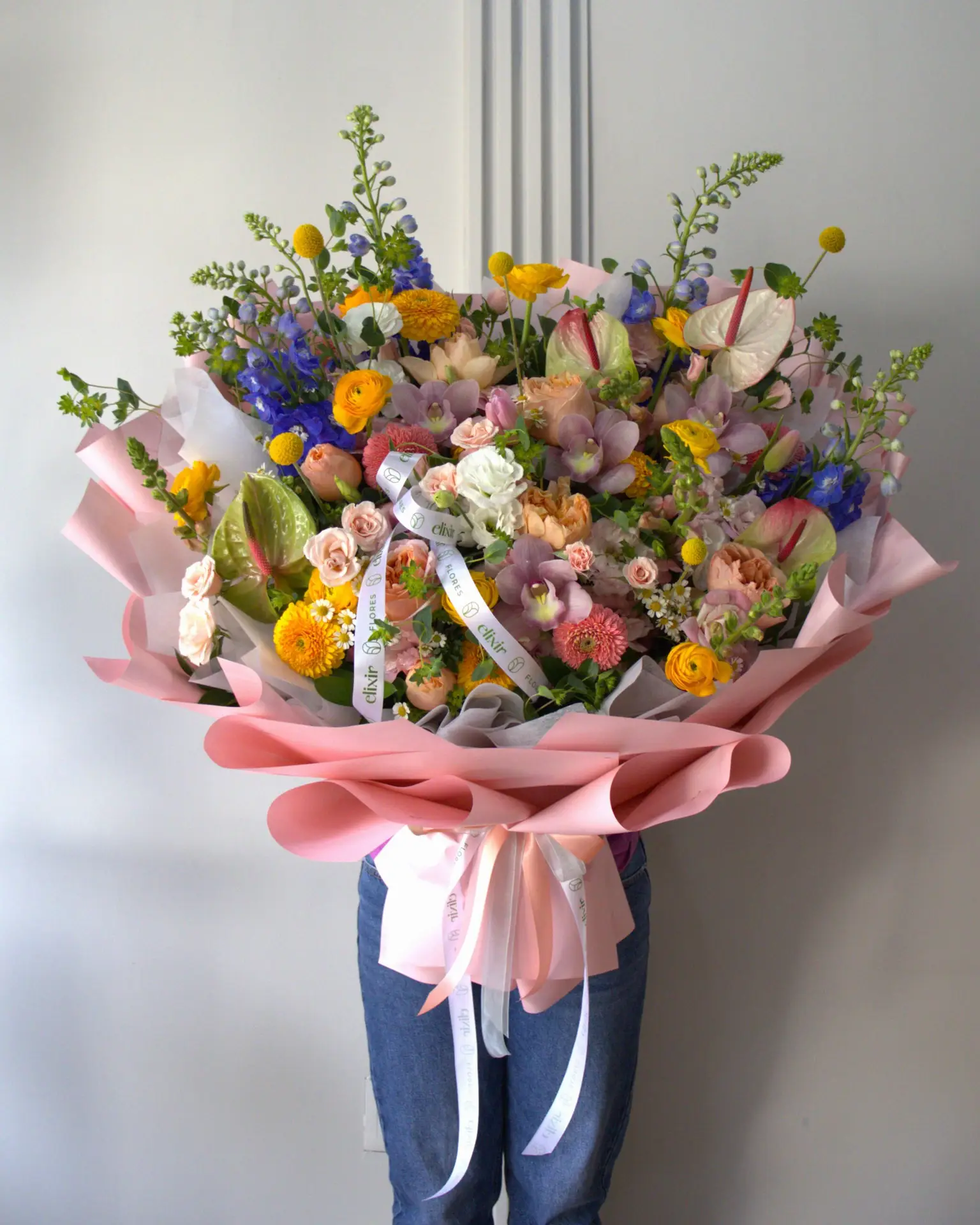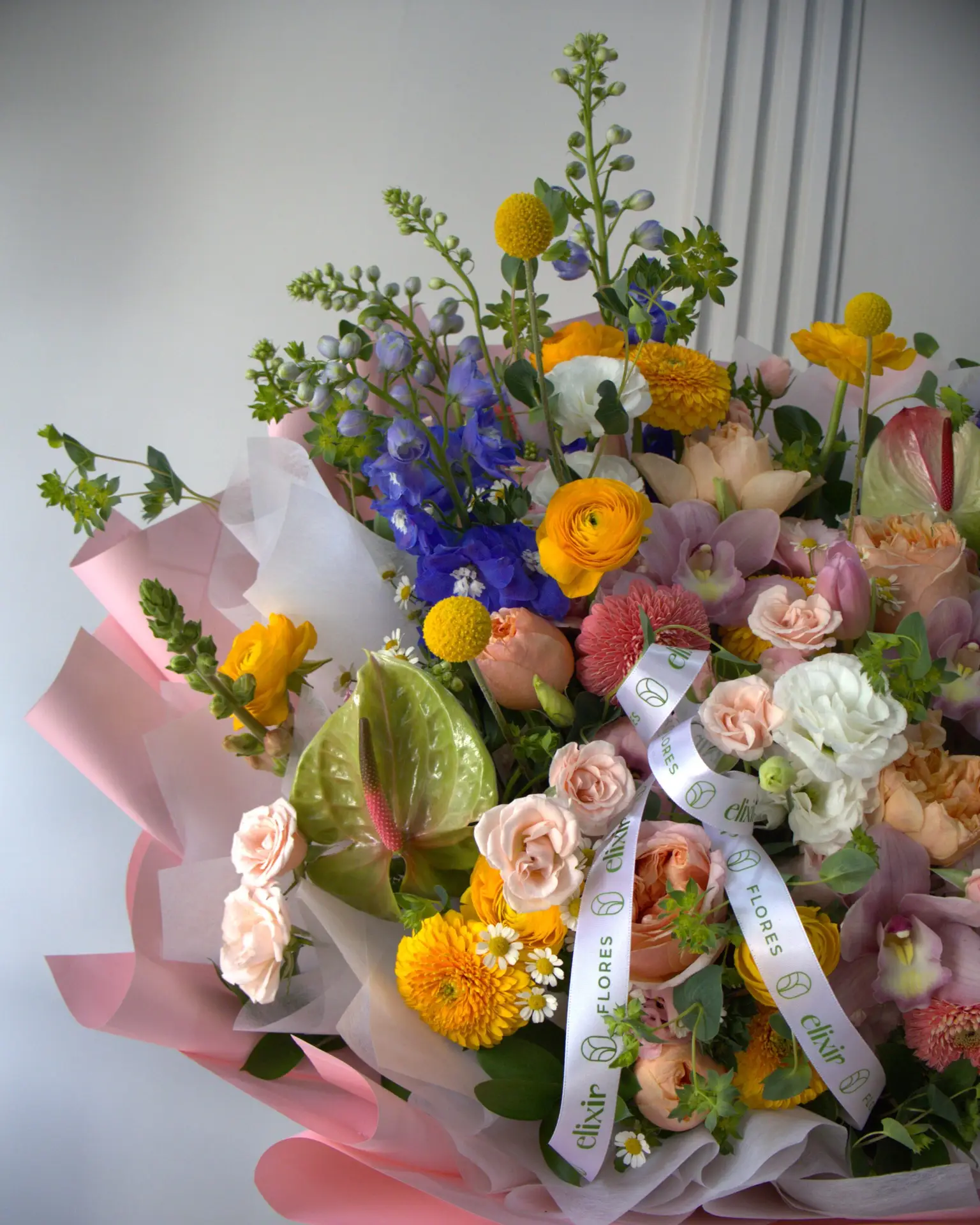 Compuesto por: Orquídea cymbidium, Ranúnculo, Delfinium, Anturio, Craspedia, Rosa inglesa, Gerbera multipetalos, Mini rosa, Perritos, Gerbera, Lisianthus, Santa maría.