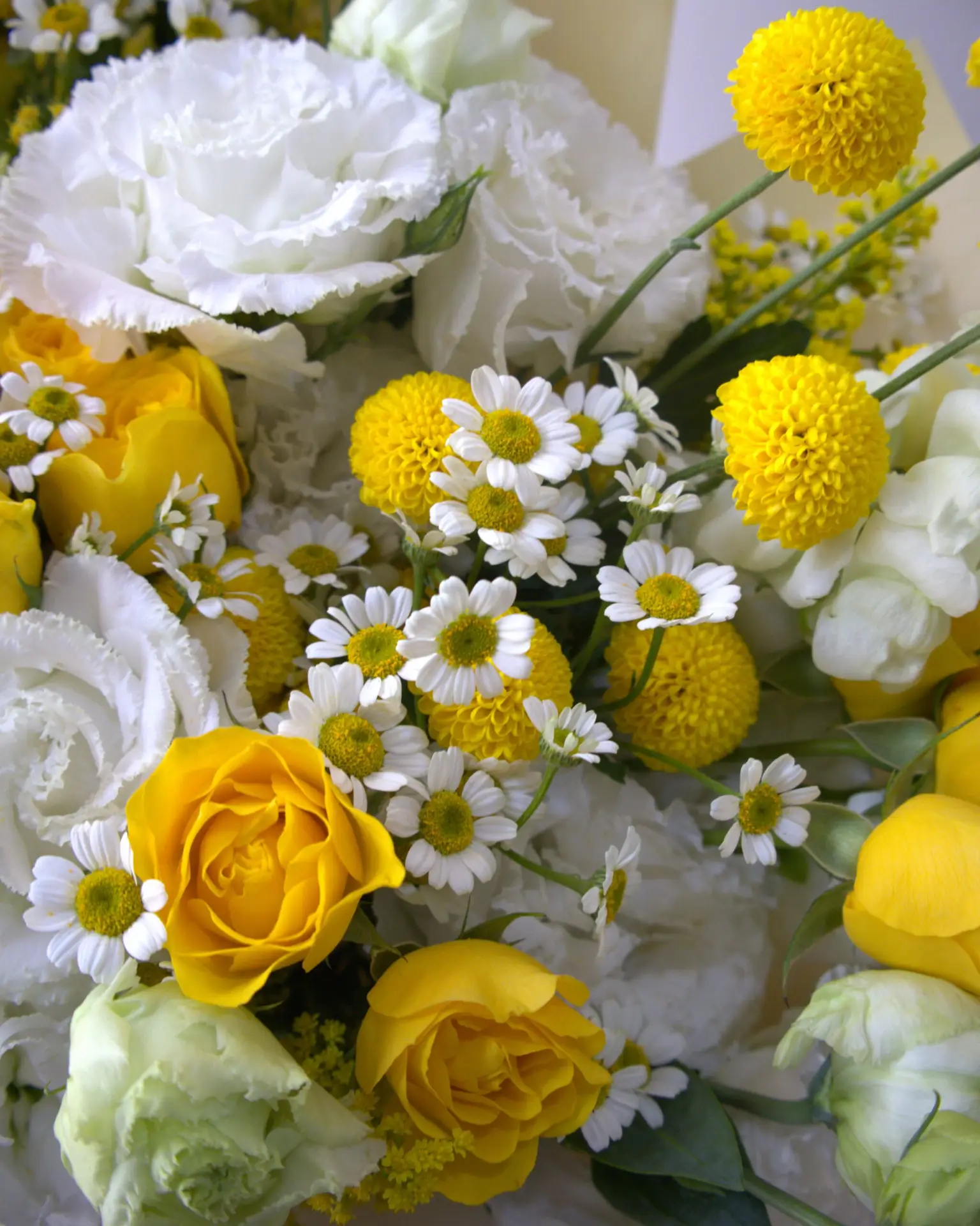 El ramo incluye: Lisianthus, Mini rosas amarilla, Santa maría, Solidago, Perritos, Pom Pom.