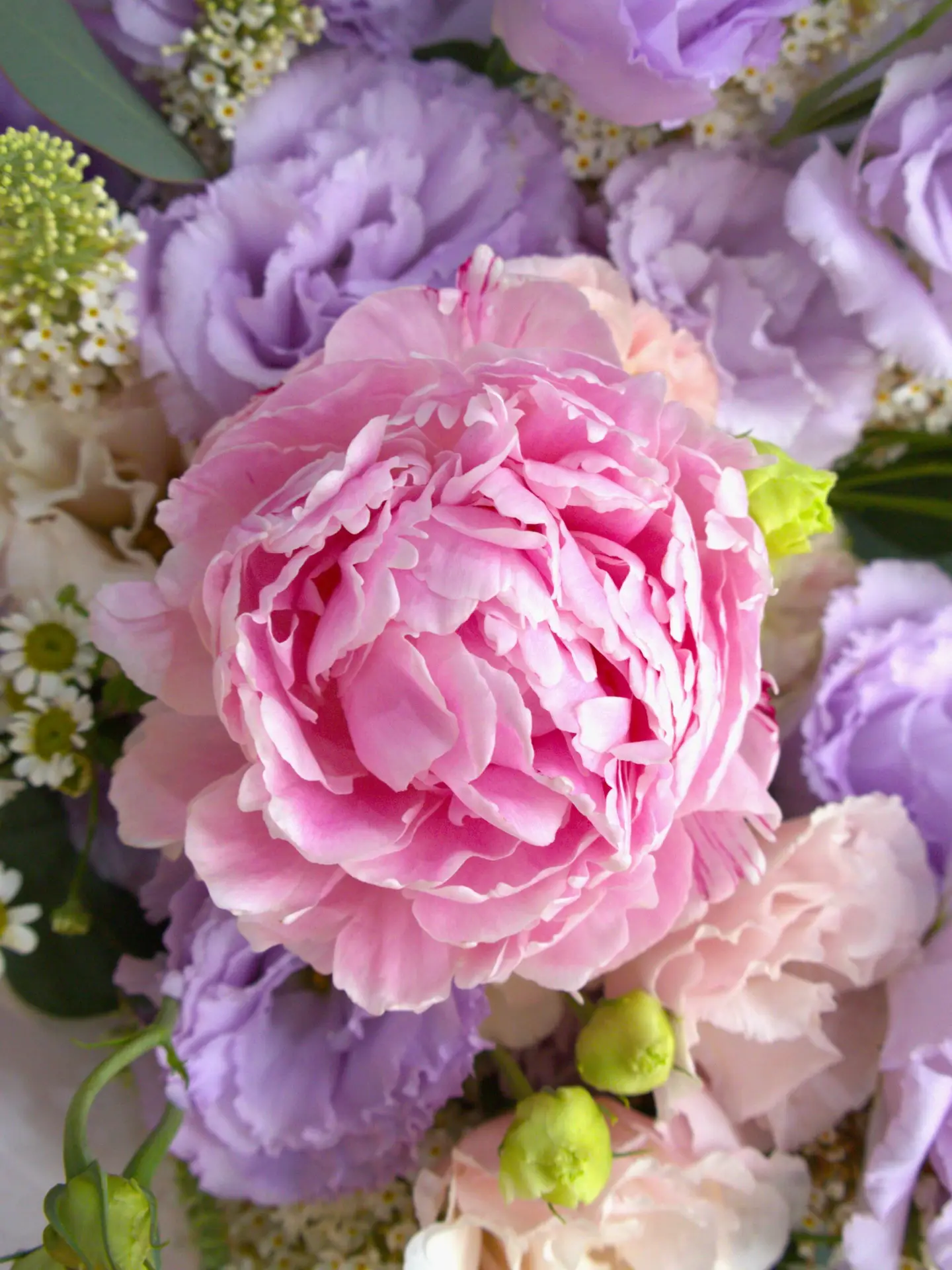 Flores Secundarias: Lisianthus Rosa y Lila, Astilve, Silver Dólar