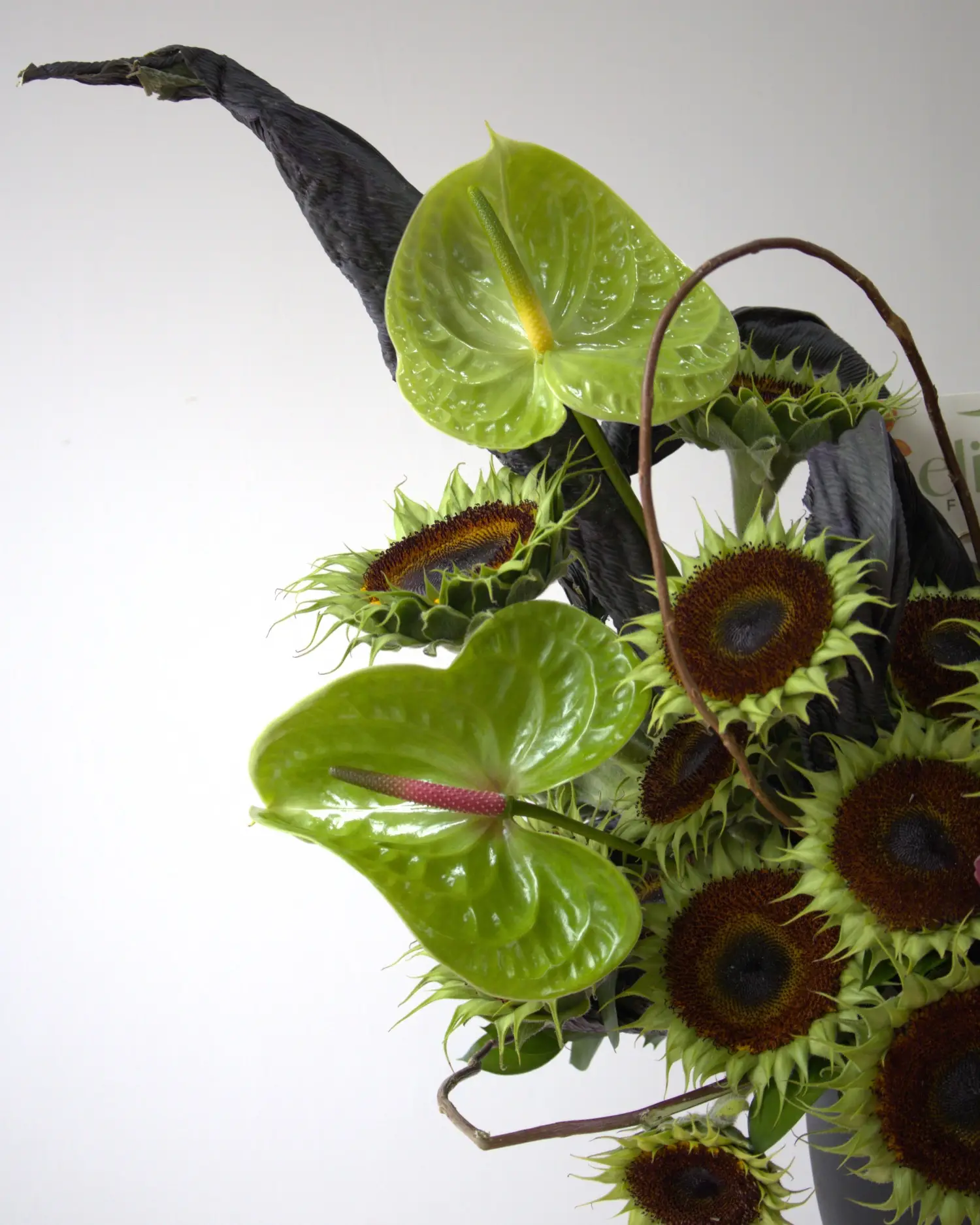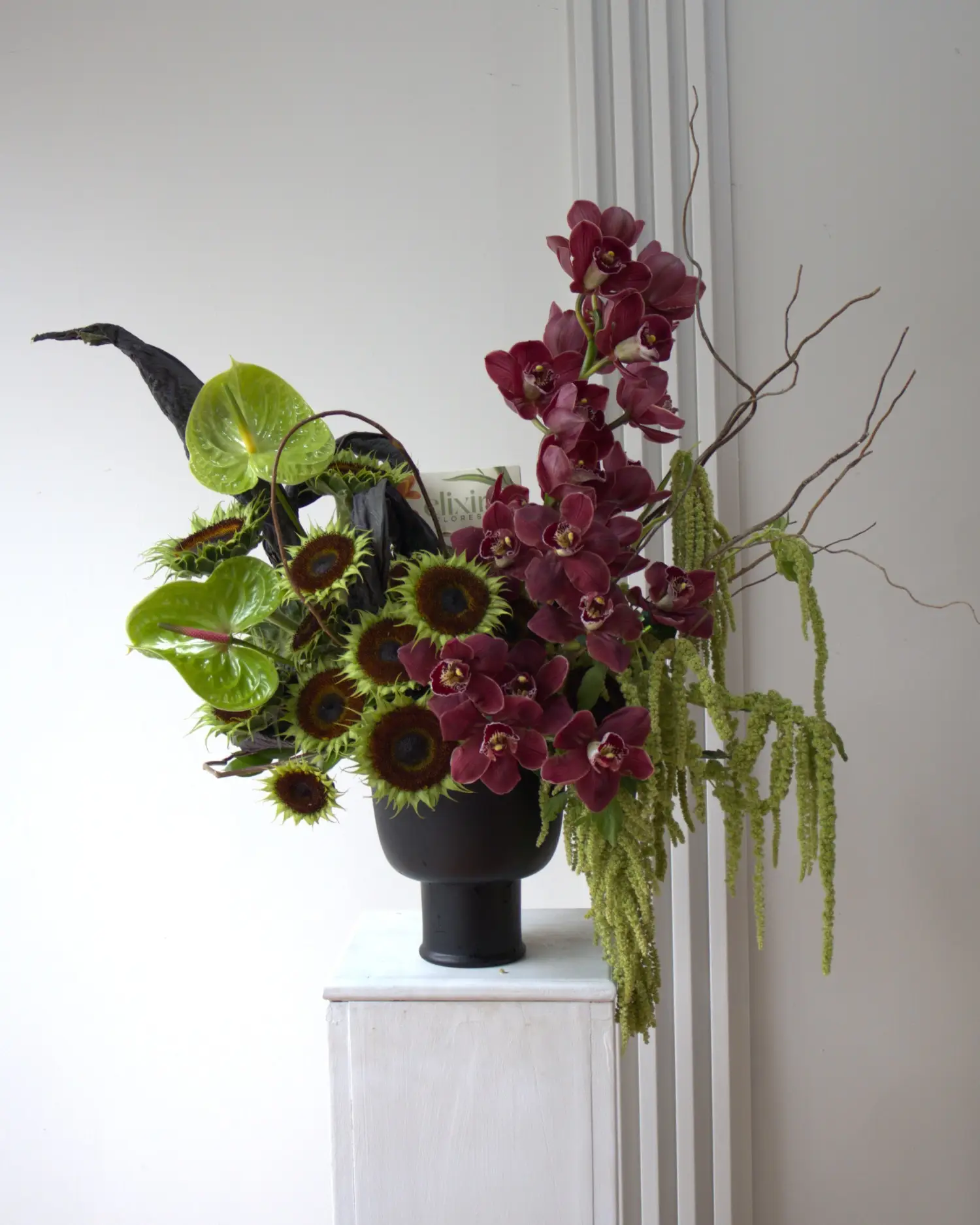 Arreglo floral compuesto por oquídeas cymbidium vino, anturios verde, girasoles, calathea, curly y amaranto.