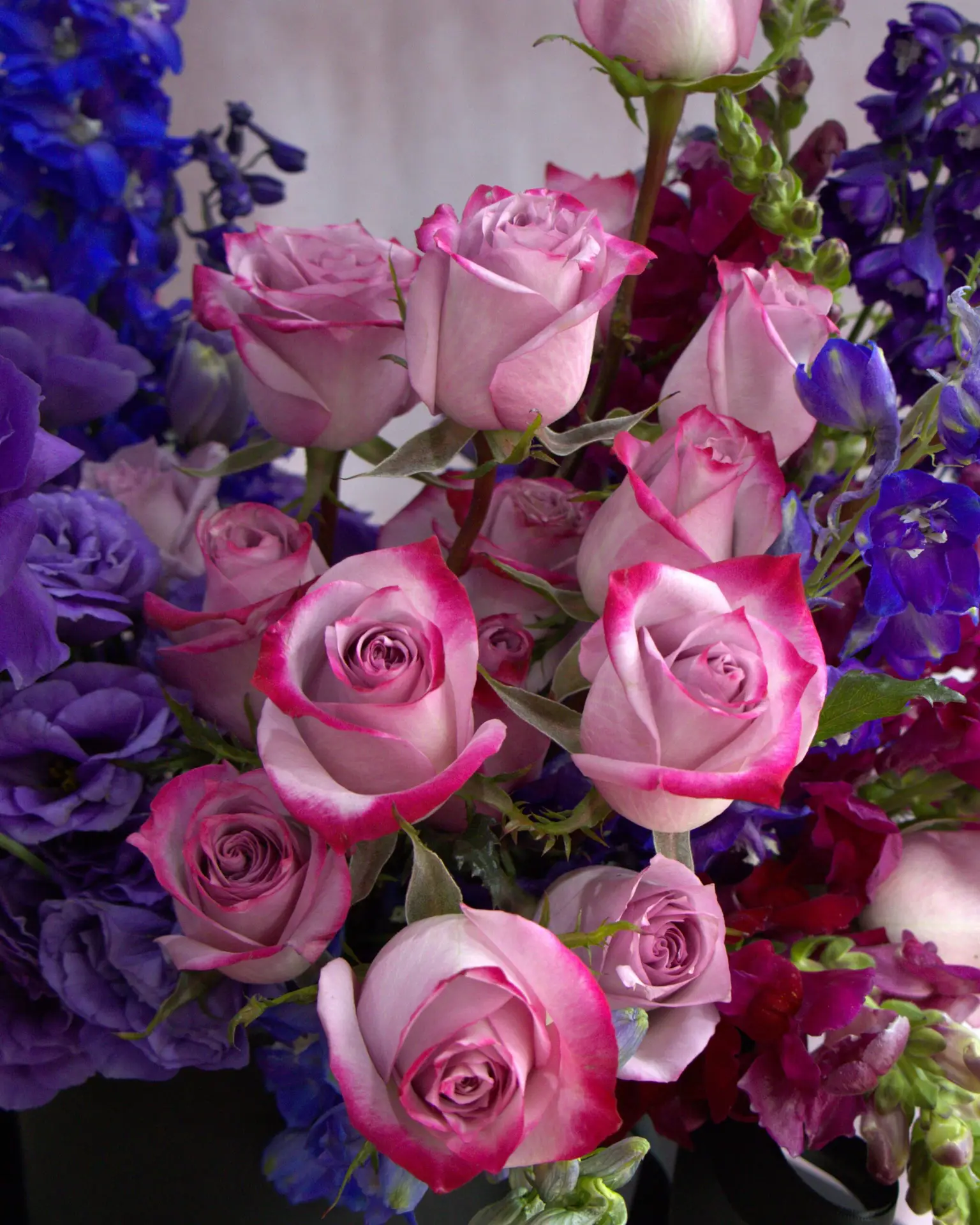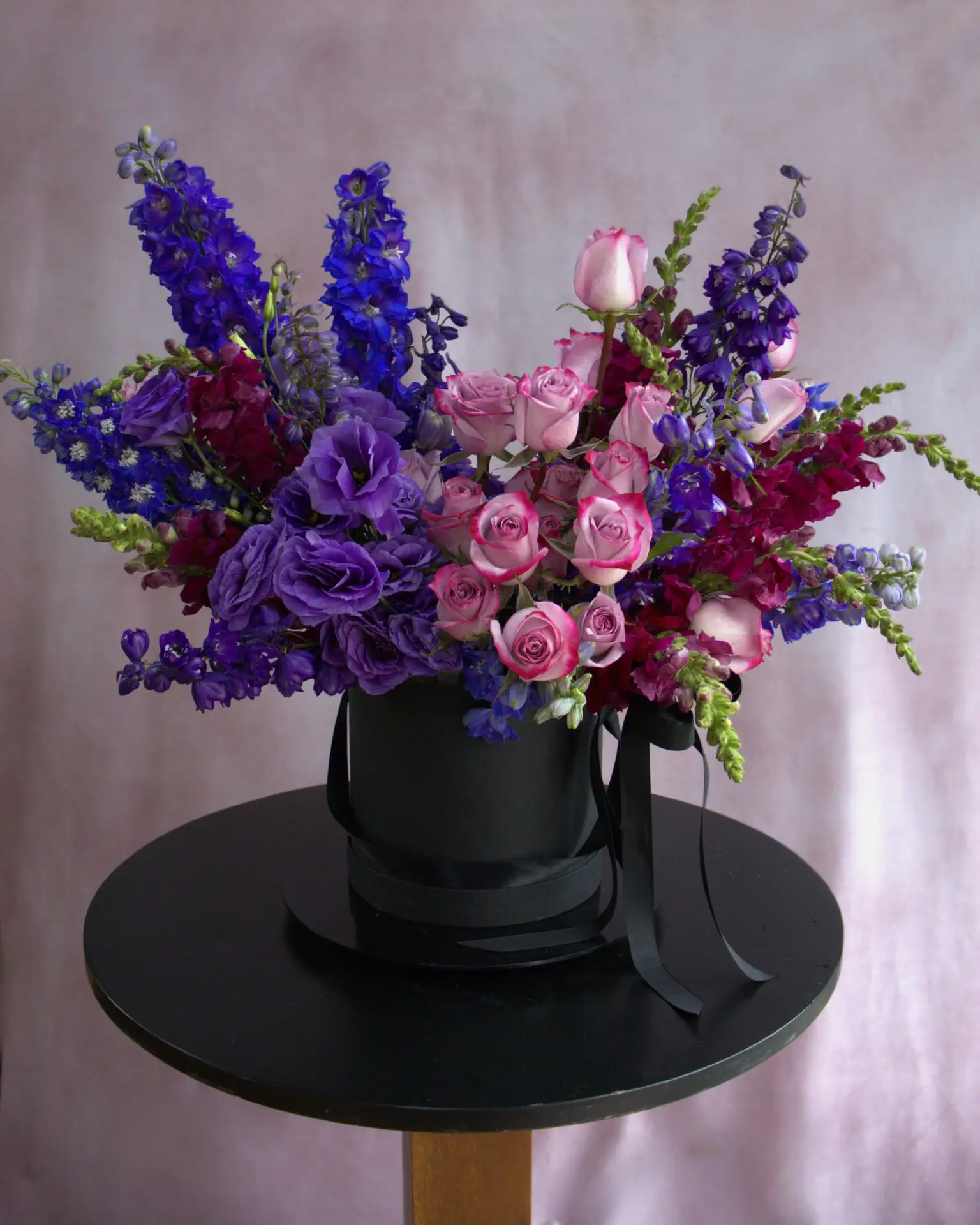 Flores que contiene el Arreglo: Delifinium, Rosas, Lisianthus, Perritos.